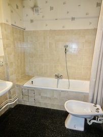 De betegelde badkamer op zwarte vloer is voorzien van een ligbad, enkele lavabo en bidet
