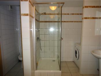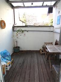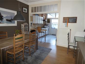 Living op laminaat met prachtige authentieke marmer schouw, open keuken op tegels met gaskookplaat en afzuigkap. Achter de keuken die ligt een soort ingesloten terras op bankirai, 1 slaapkamer op tegels met aansluitend de badkamer met douche, dubbele lavabo en toilet.