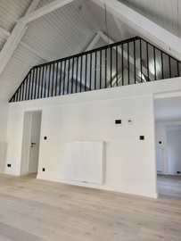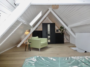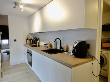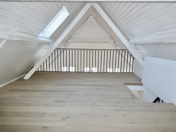 Living/leefruimte op plankenvloer met toffe bovengelegen mezzanine grote ruimte. Keuken voorzien van kookplaat, afzuigkap, oven en vaatwasser. 2 slaapkamer op planken vloer. Badkamer met douche, meubel met lavabo + spiegel met verlichting en toilet + handdoekwarmer.