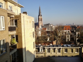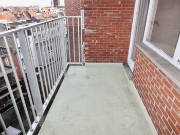 De keuken (8m²) eveneens met fruttegels, witte aanbouwkasten en spoelbak. Twee grote slaapkamers (15m2 en 11m2) waarvan er één toegang geeft tot het ruim terras van 5m2 waar men makkelijk een eettafel en ligbed zou kunnen plaatsen.